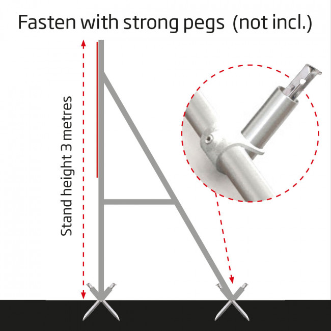 Freistehender Rahmen auf Hochständer. Eine robuste Außenbannersystem aus kräftige 3 mm / Ø 48 mm Aluminium Röhre für Präsentation von PVC-Banners im Großformat.