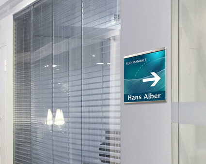 Glassnox ist die ideale Beschilderung für modernes Ambiente! Dank des cleveren Designs ist jede Einzelblattinfo schnell und einfach zu wechseln. Die Abdeckungen aus kristallblauem Acrylglas oder temperiertem Glas werden zum Öffnen einfach nach oben geschoben. Der extra flache und schlanke Rahmen aus gebürstetem Edelstahl gibt jeder Präsentation den richtigen rahmen. Alle glassnox Produkte können auch mit speziellem Doppelkleber auf glatten Oberflächen befestigt werden. glassnox ist ideal für die elegante Tür- und Etagenbeschilderung oder häufig wechselnde Information.